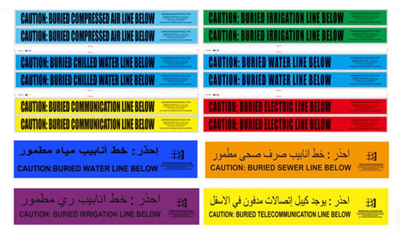 Detecteerbare Ondergrondse Waarschuwingstape is een speciaal gelamineerde pet / folie / poly-blend. Deze verbazingwekkende blend (met polyester) biedt uitzonderlijke sterkte-eigenschappen in vergelijking met andere detecteerbare waarschuwingstapes van puur polyethyleen. De gedurfde zwarte boodschap op de APWA-kleurgecodeerde achtergrond is behandeld om niet te degraderen of te vervagen wanneer deze wordt blootgesteld aan alkaliën, zuren en/of andere destructieve elementen ondergronds.